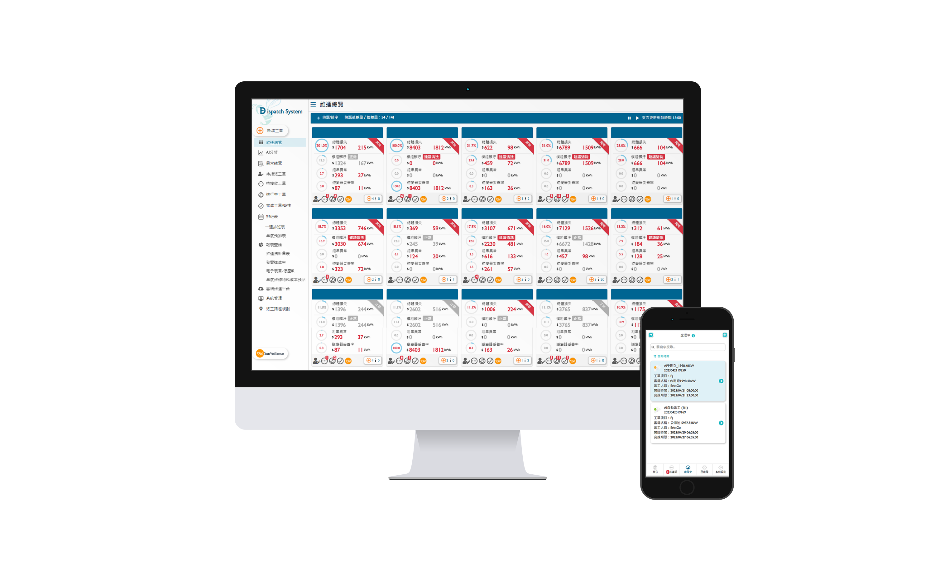 至尊国际太陽能智能運維管理系統包括雲端監控工具、AI分析與智慧自動派工及運維APP,實現電廠自主管理。